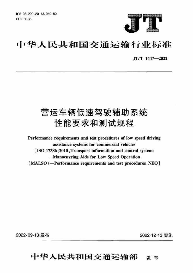 标准名称:营运车辆低速驾驶辅助系统性能要求和测试规程