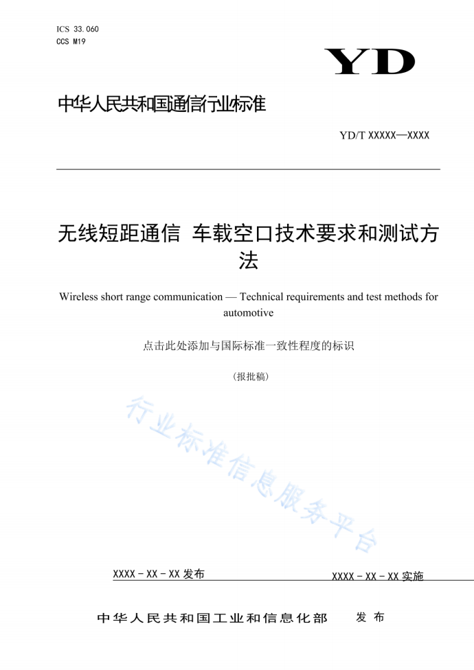 标准名称:无线短距通信 车载空口技术要求和测试方法