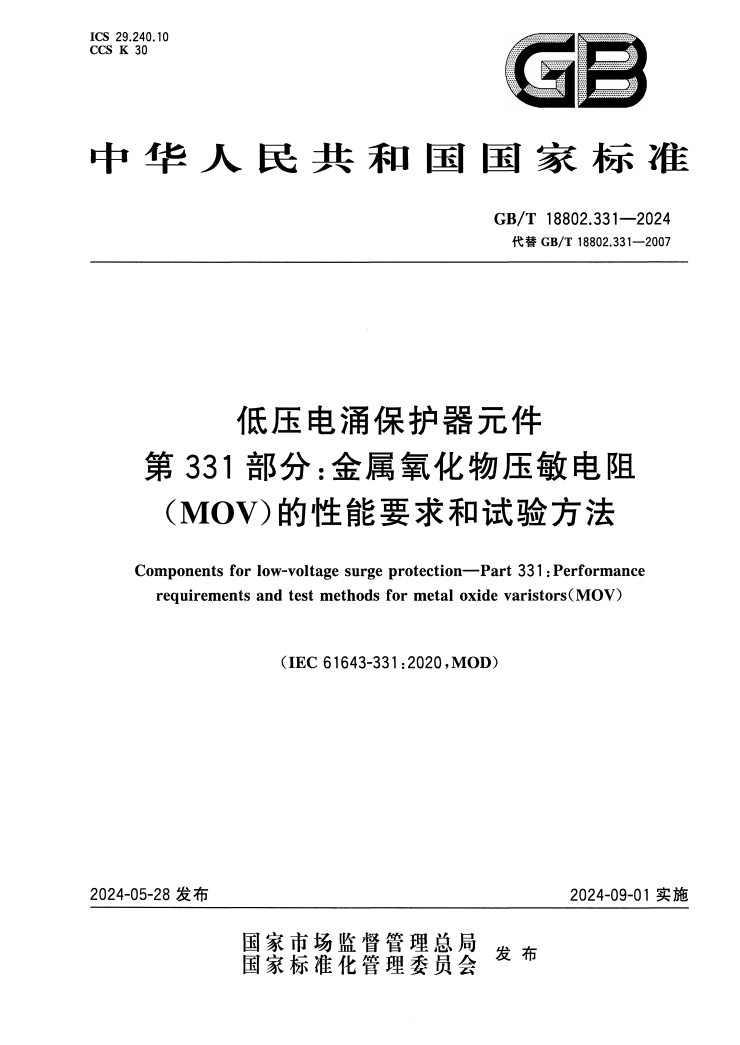 GB/T 18802.331-2024 低压电涌保护器元件 第331部分:金属氧化物压敏电阻(MOV)的性能要求和试验方法