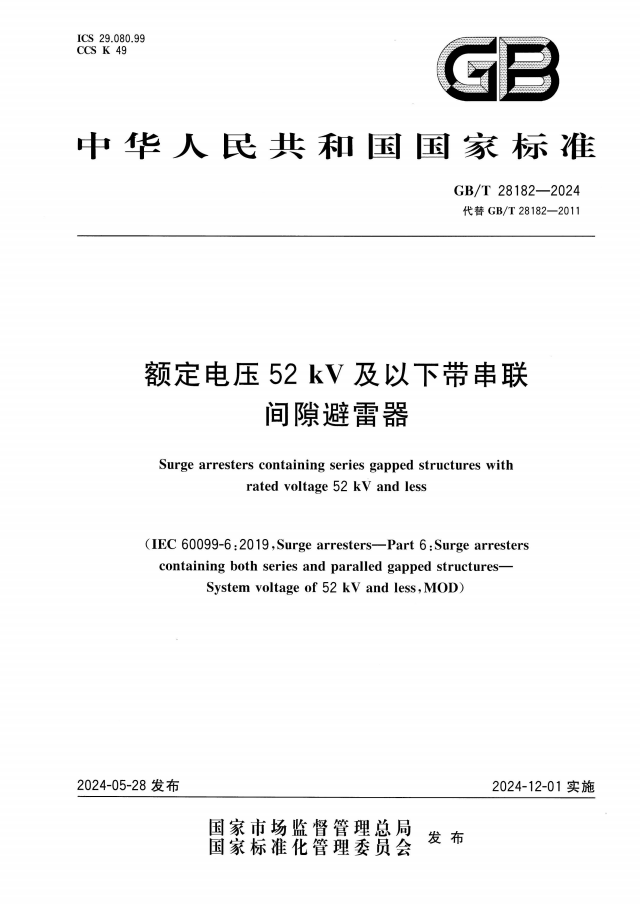 英文名称:Surge arresters containing series gapped structures with rated voltage 52 kV and less