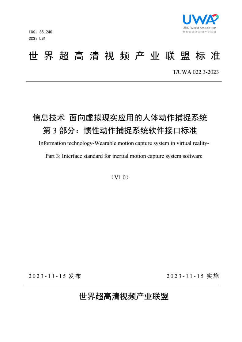 标准名称:信息技术 面向虚拟现实应用的人体动作捕捉系统 第 3 部分:惯性动作捕捉系统软件接口标准