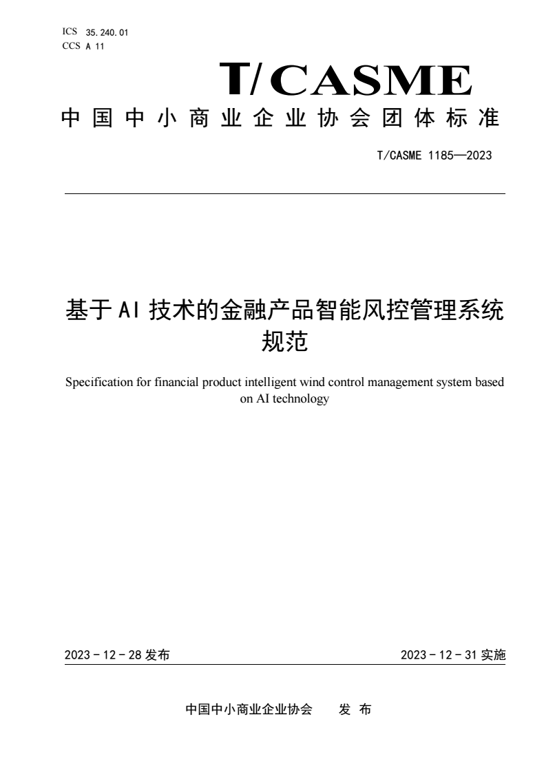 英文名称:Specification for financial product intelligent wind control management system based on AI technology