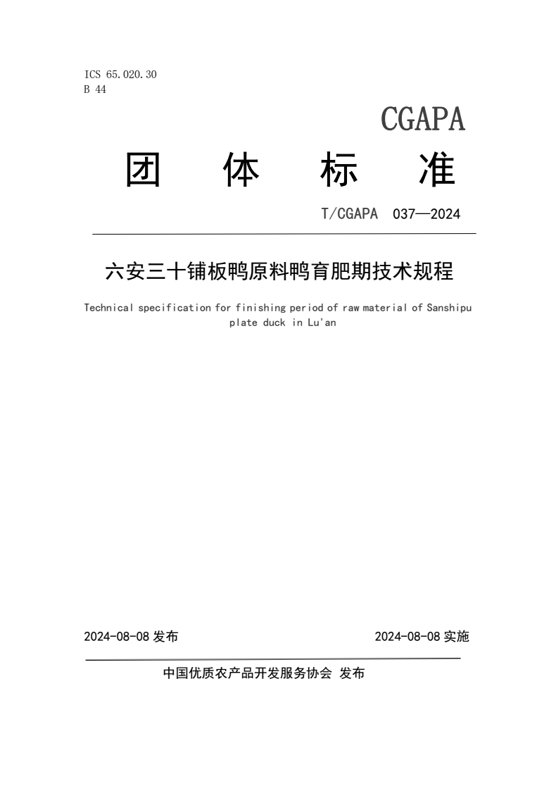 标准名称:六安三十铺板鸭原料鸭育肥期技术规程
