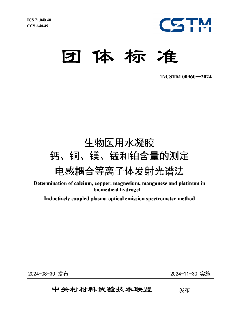 T/CSTM 00960-2024 生物医用水凝胶 钙、铜、镁、锰和铂含量的测定 电感耦合等离子体发射光谱法