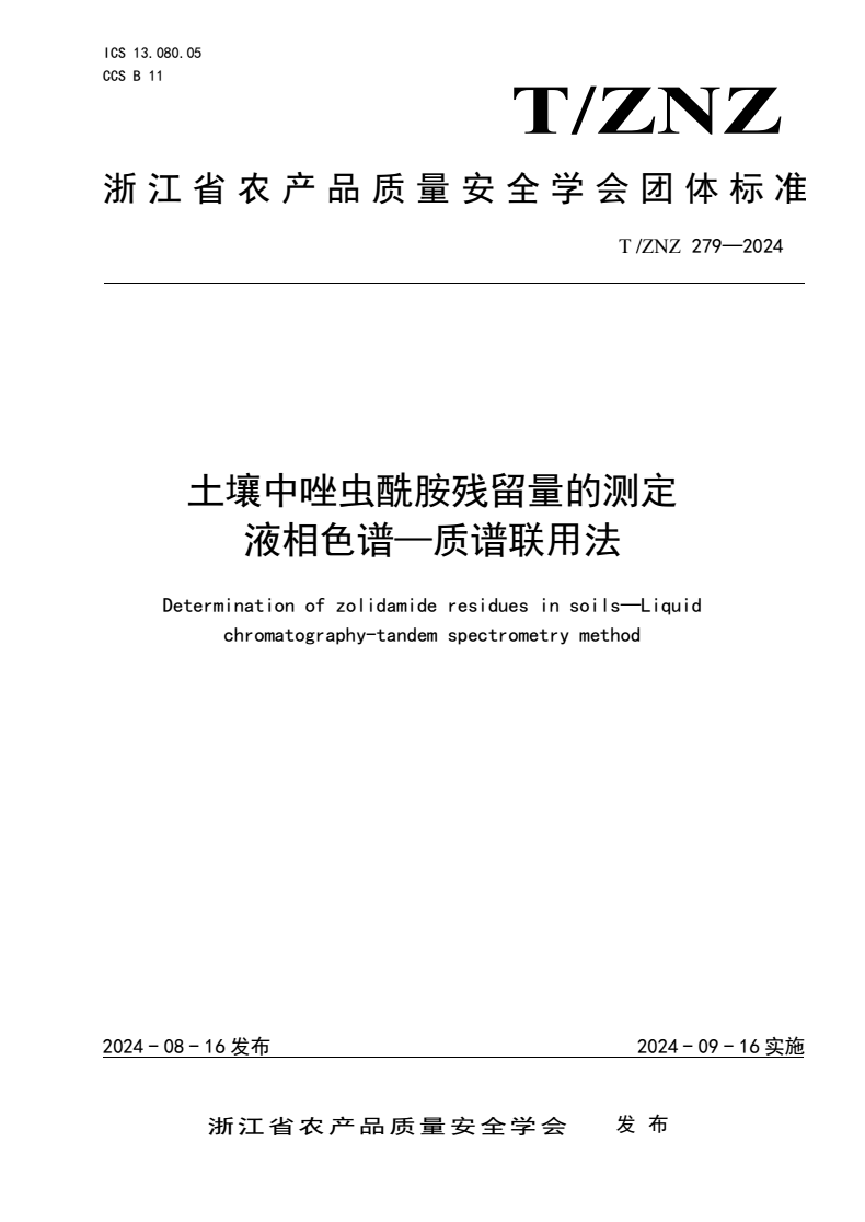 T/ZNZ 279-2024 土壤中唑虫酰胺残留量的测定 液相色谱—质谱联用法