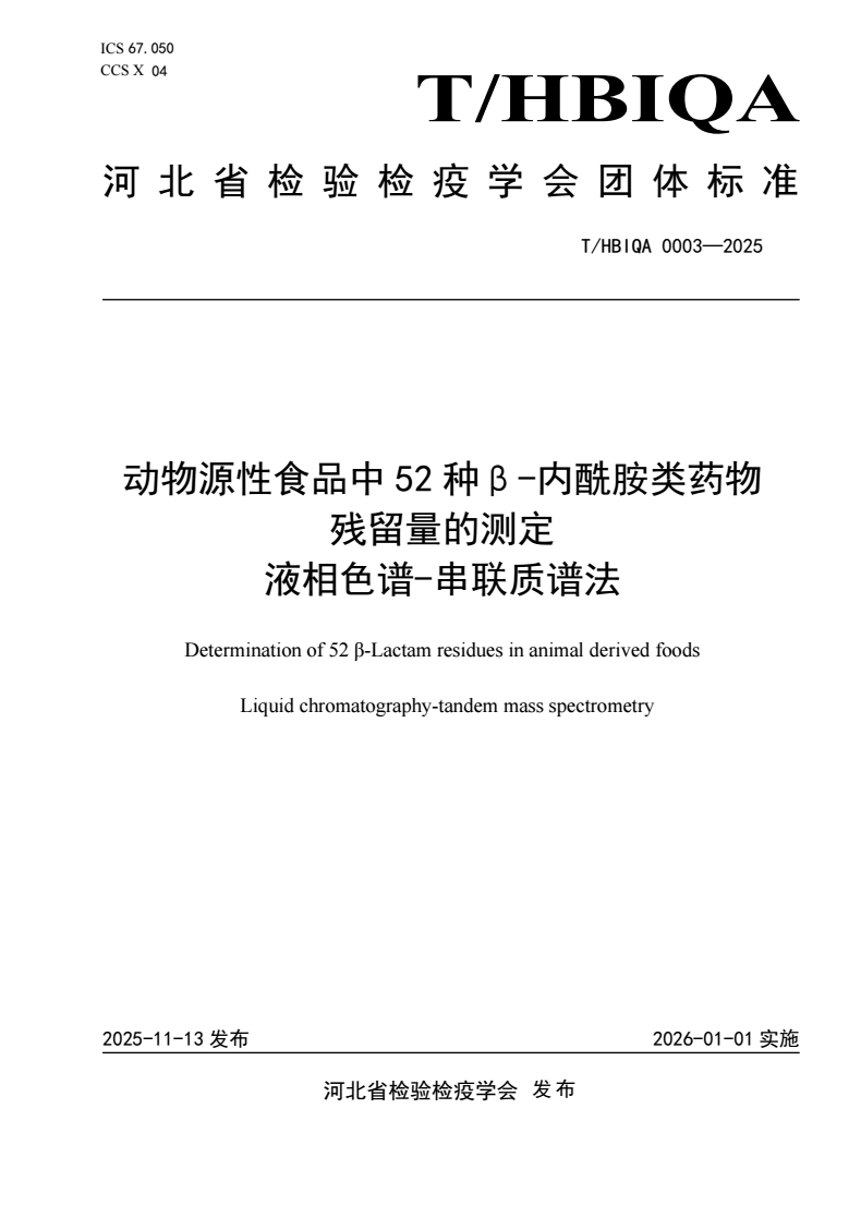标准名称:动物源性食品中52种β-内酰胺类药物残留量的测定 液相色谱-串联质谱法