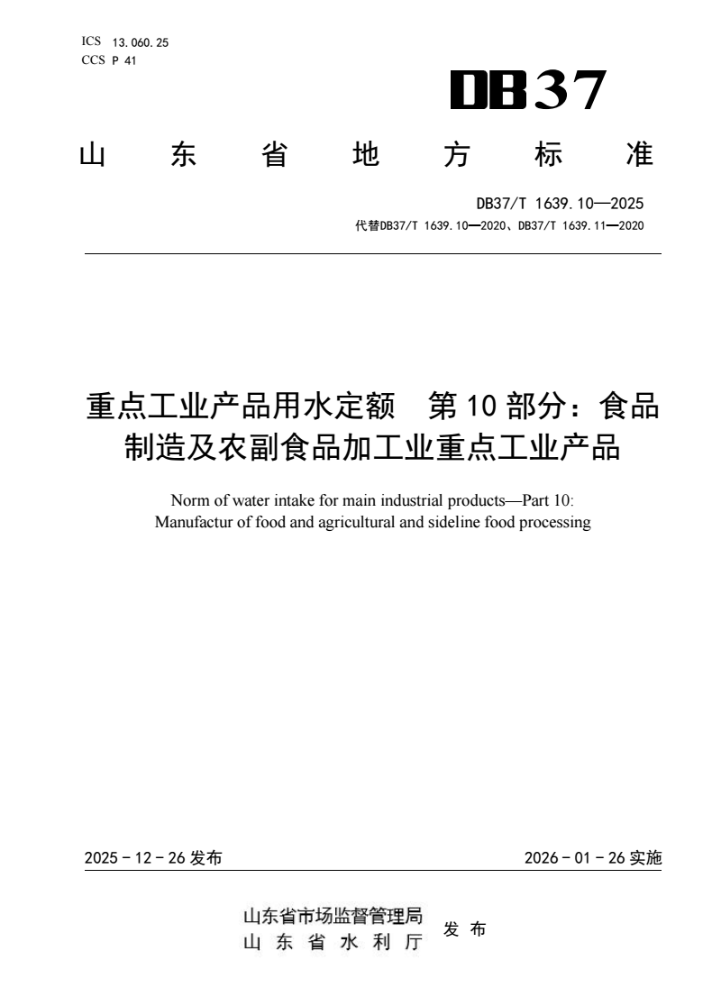 标准名称:重点工业产品用水定额 第10部分:食品制造及农副食品加工业重点工业产品