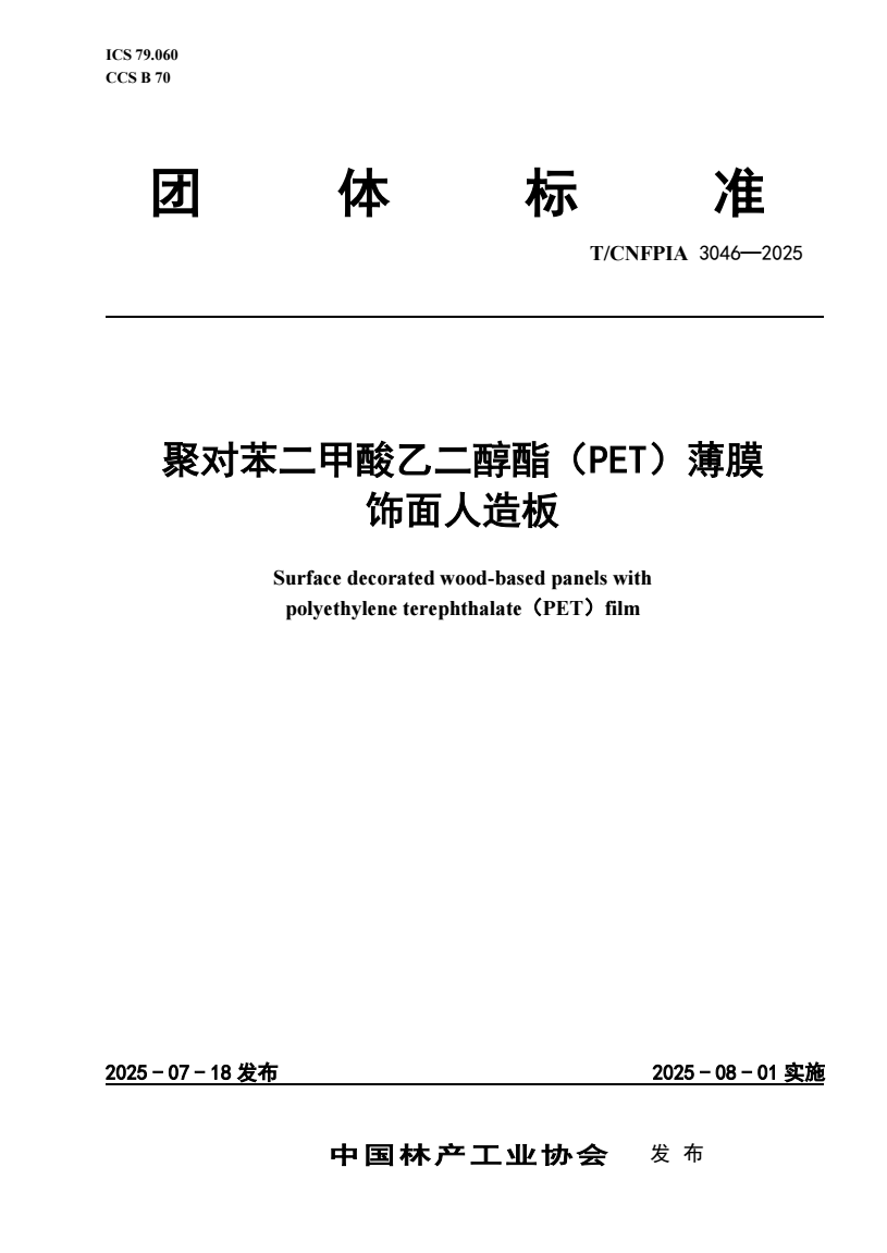 标准名称:聚对苯二甲酸乙二醇酯(PET)薄膜饰面人造板