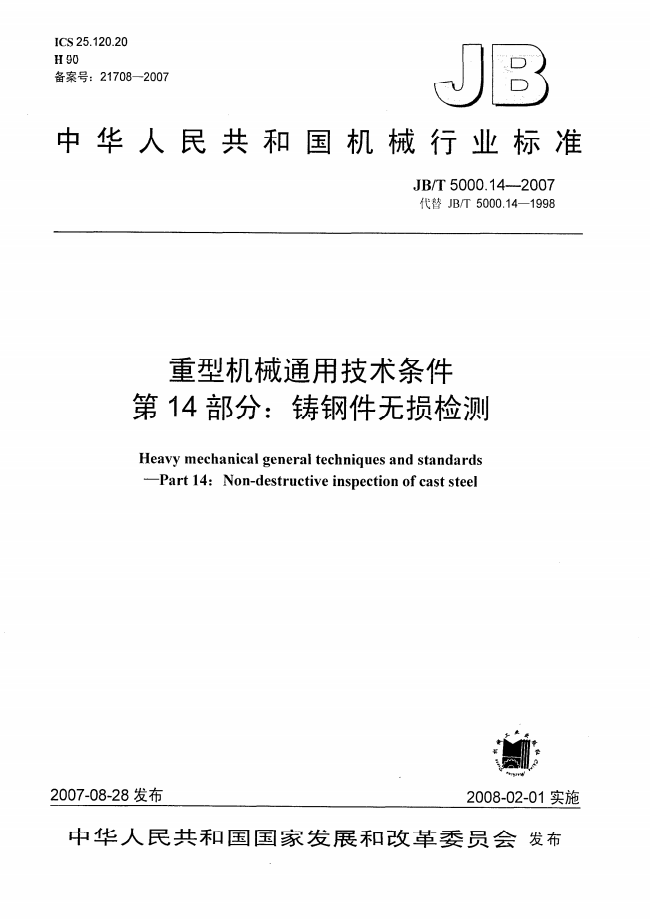 JB/T 5000.14-2007 重型机械通用技术条件 第14部分:铸钢件无损探伤