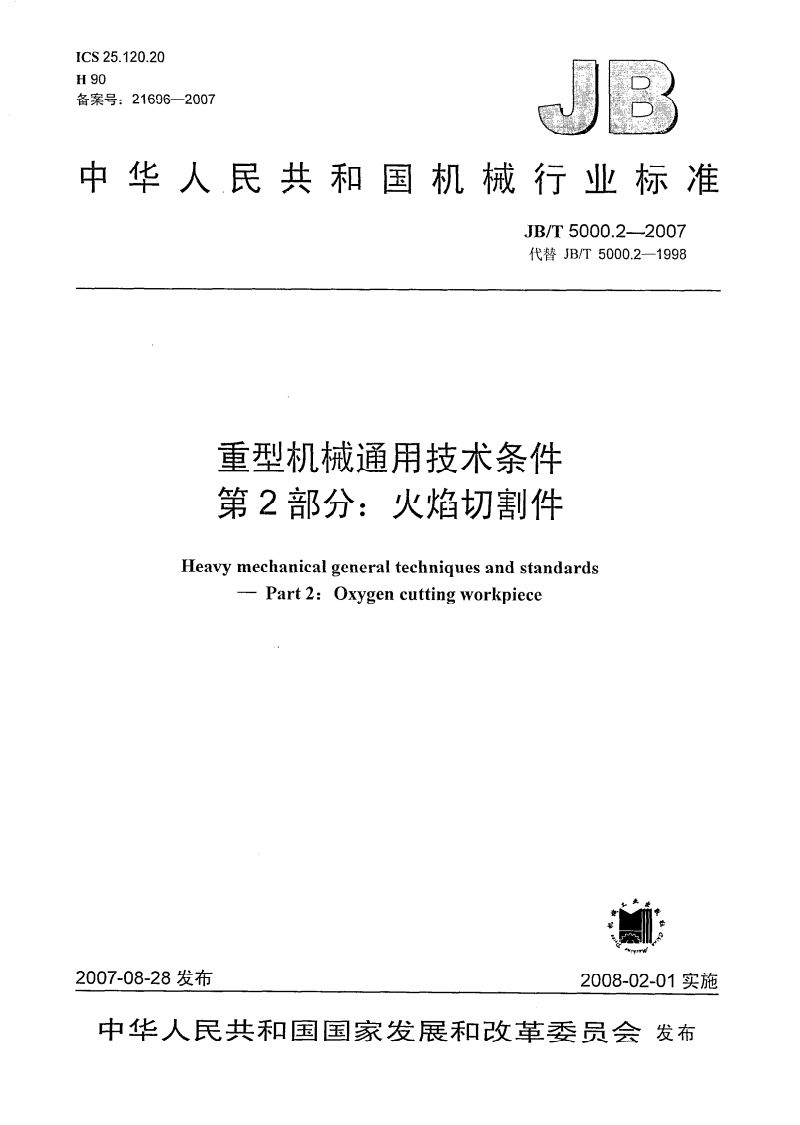 标准名称:重型机械通用技术条件 第2部分:火焰切割件