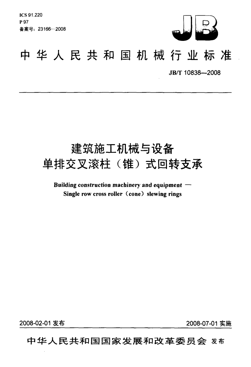 JB/T 10838-2008 建筑施工机械与设备 单排交叉滚柱(锥)式回转支承