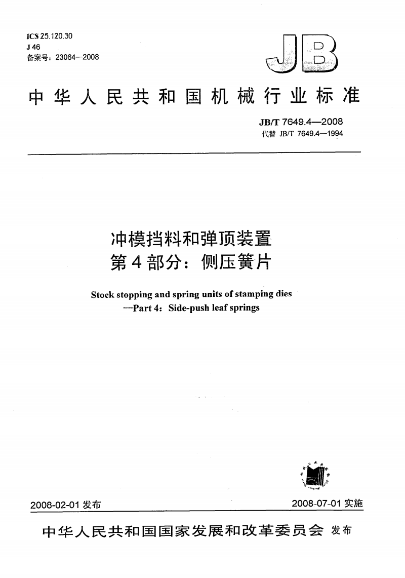 JB/T 7649的本部分规定了冲模侧压簧片的尺寸规格和标记。