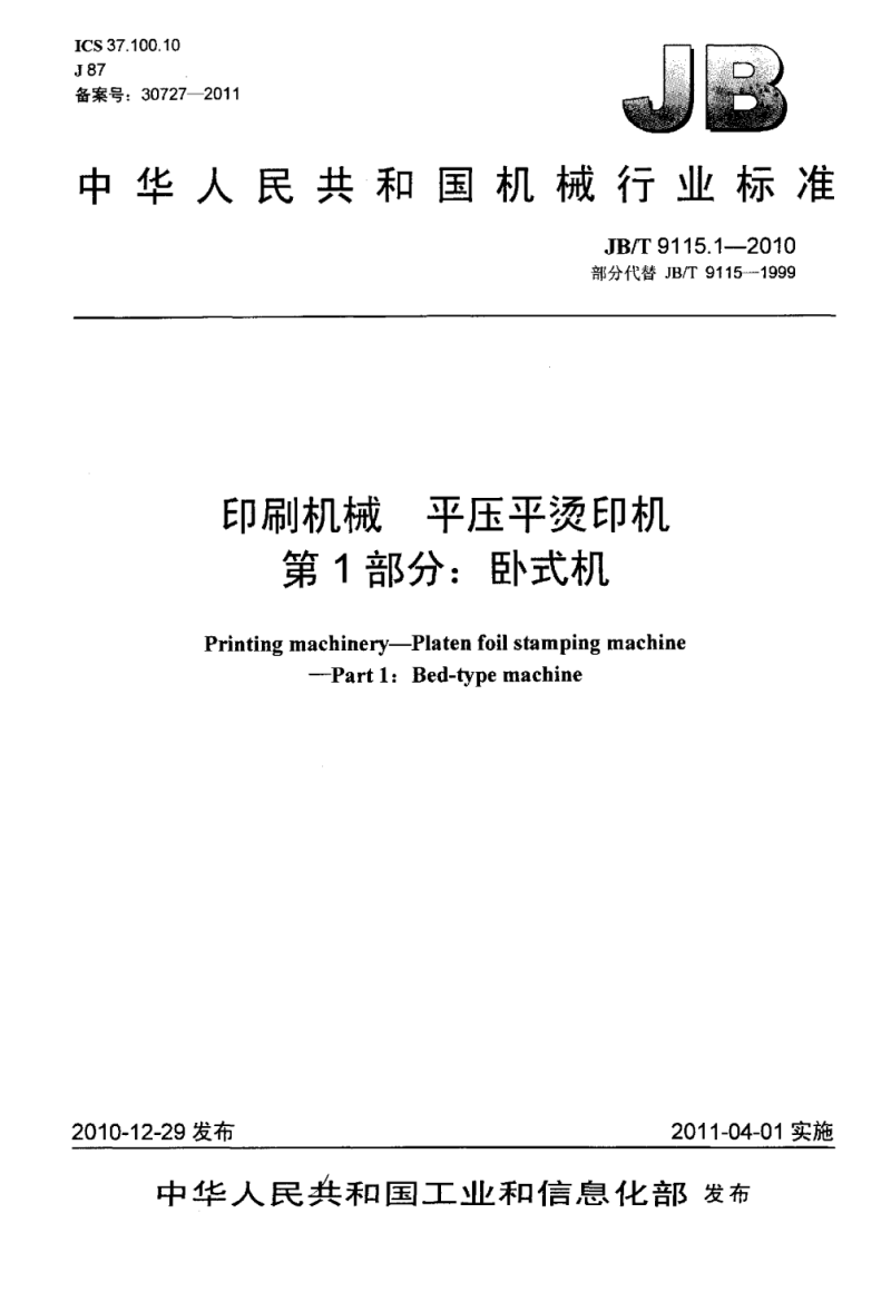 标准名称:印刷机械 平压平烫印机 第1部分:卧式机