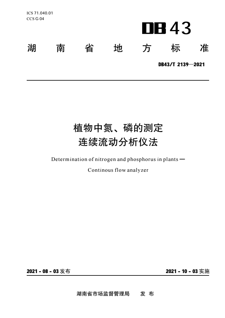 标准名称:植物中氮、磷的测定 连续流动分析法