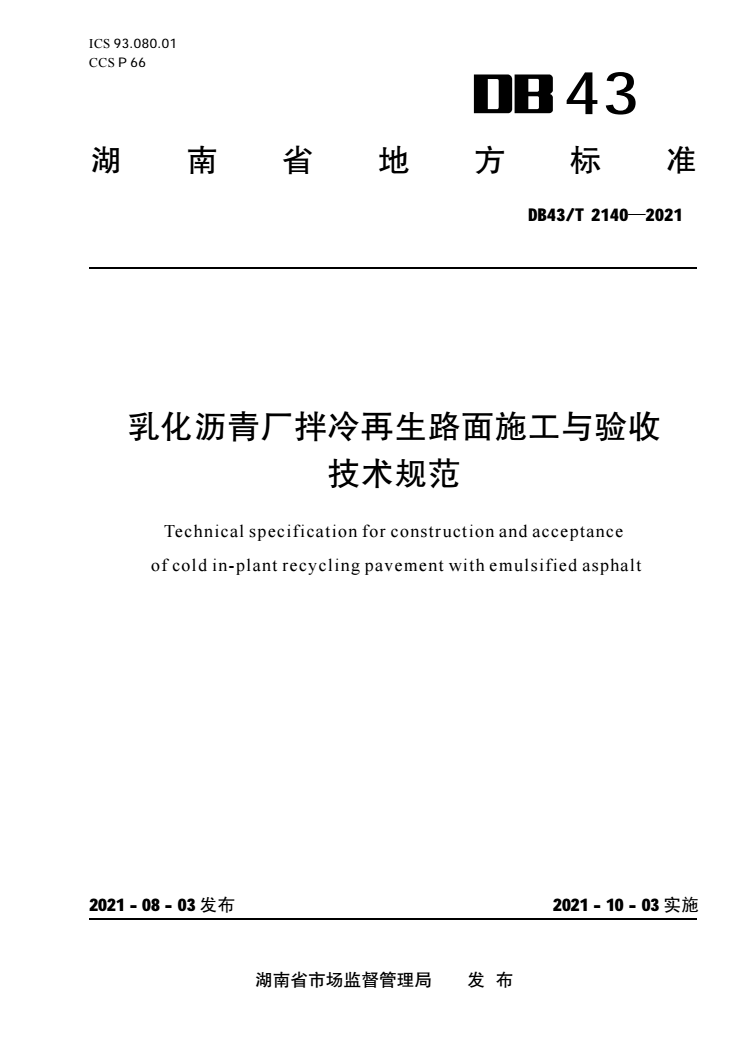 DB43/T 2140-2021 乳化沥青厂拌冷再生路面施工与验收技术规范