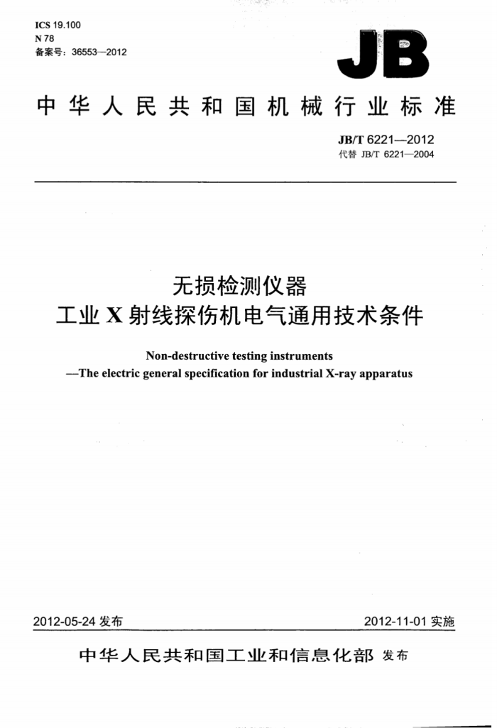 JB/T 6221-2012 无损检测仪器 工业X射线探伤机电气通用技术条件