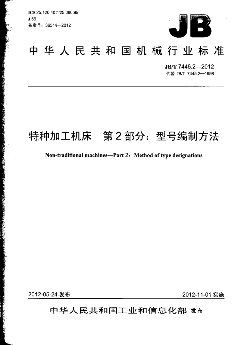 JB/T 7445.2-2012 特种加工机床 第2部分:型号编制方法