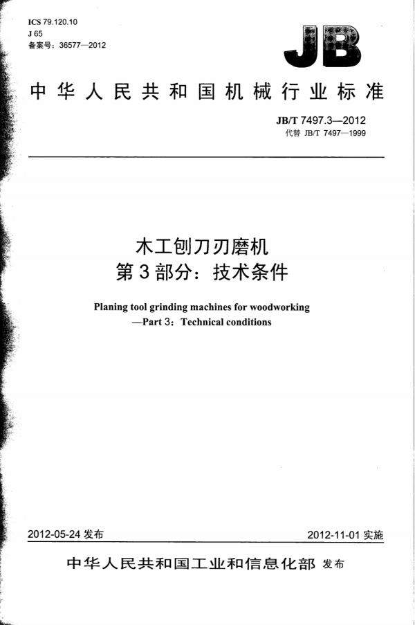 JB/T 7497.3-2012 木工刨刀刃磨机 第3部分:技术条件
