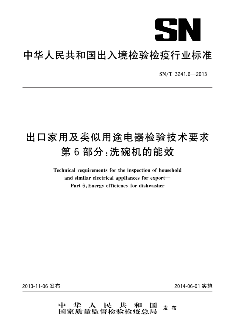 SN/T 3241.6-2013 出口家用和类似用途电器检验技术要求 第6部分:洗碗机的能效