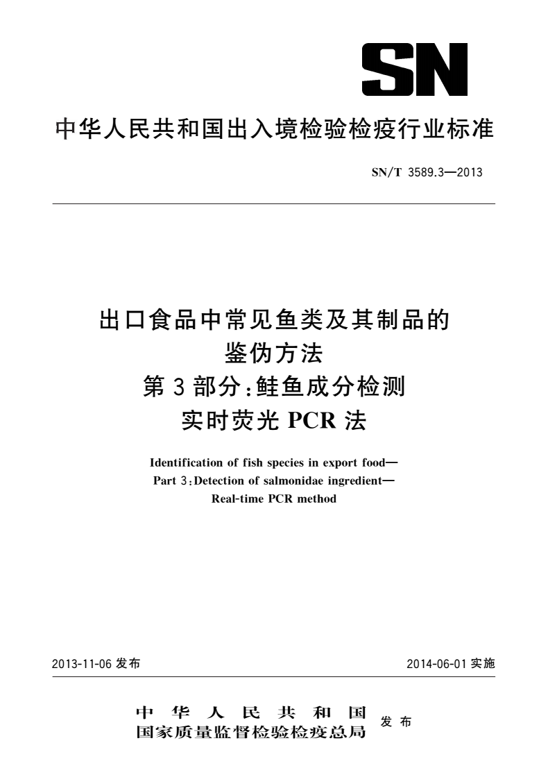 SN/T 3589的本部分规定了进出口食品中鲑科鱼类(鲑鱼)的实时荧光PCR检测方法。