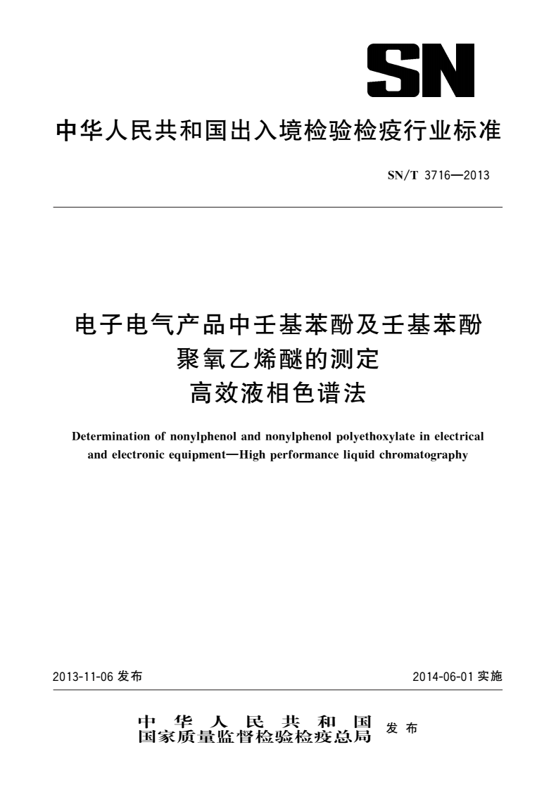 标准名称:电子电气产品中壬基苯酚及壬基苯酚聚氧乙烯醚的测定 高效液相色谱法