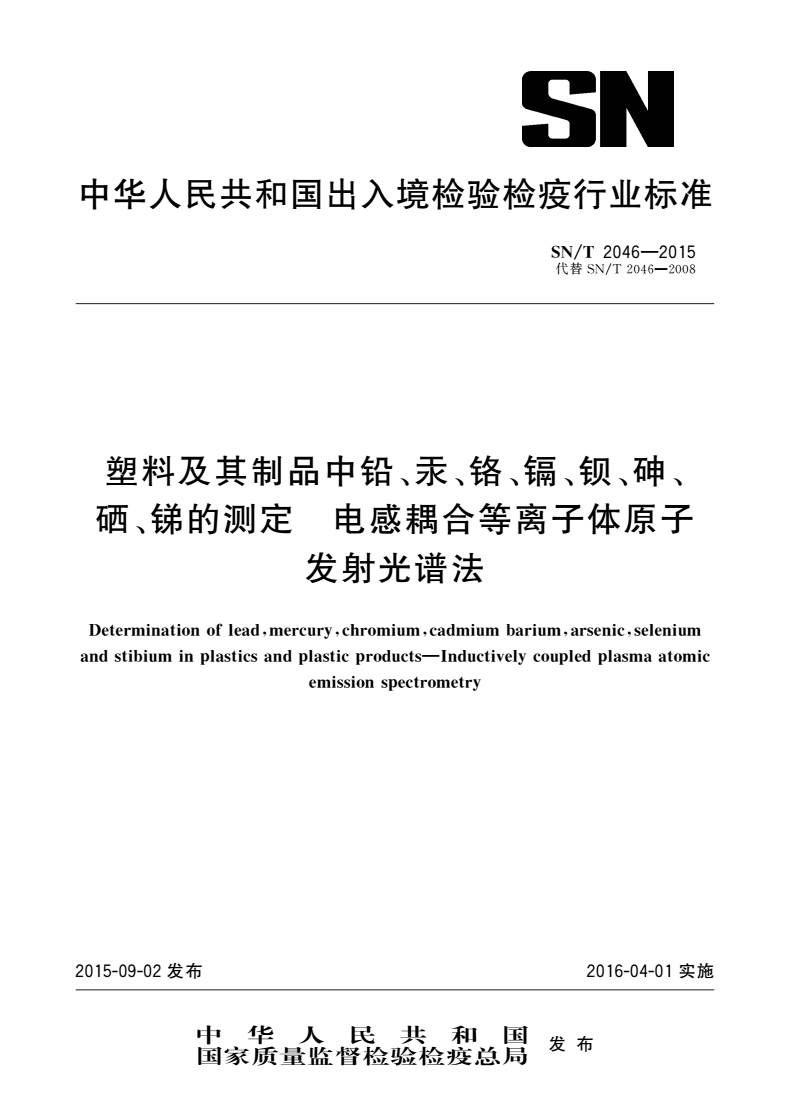 英文名称:Determination of lead,mercury,chromium,cadmium barium,arsenic,selenium and stibium in plastics and plastic products—Inductively coupled plasma atomic emission spectrometry