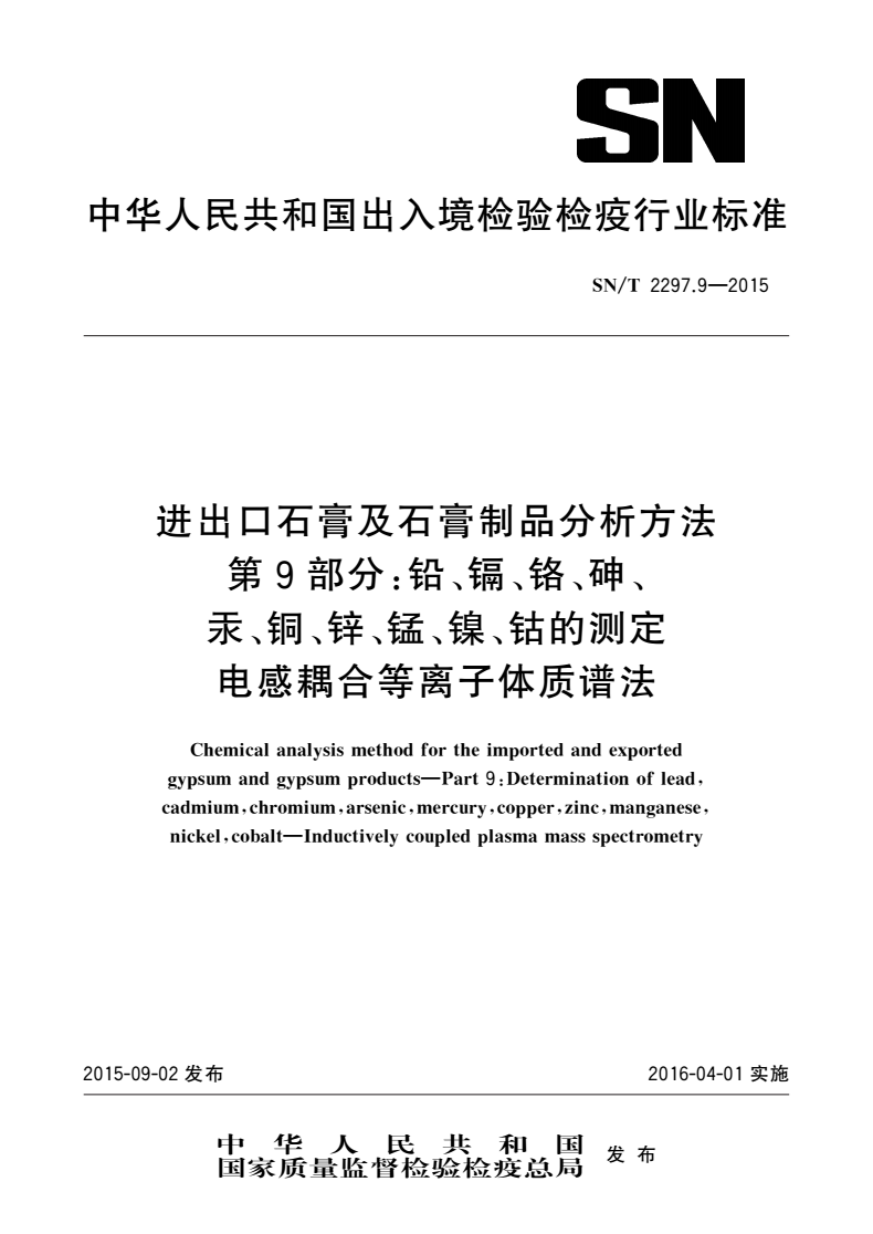 SN/T 2297的本部分规定了进出口石膏及石膏制品中铅、镉、铬、砷、汞、铜、锌、锰、镍、钴电感耦合等离子体质谱法(ICP-MS)测定方法