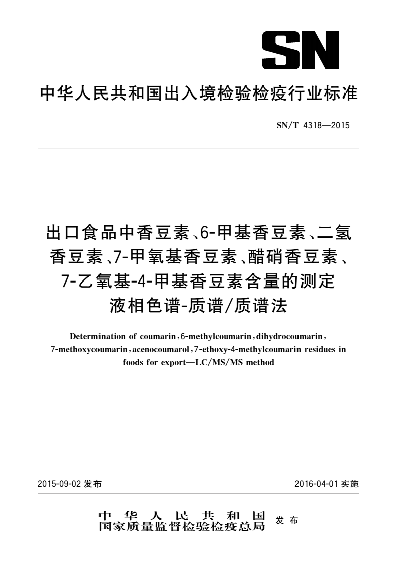 标准名称:出口食品中香豆素、6-甲基香豆素、二氢香豆素、7-甲氧基香豆素、醋硝香豆素、7-乙氧基-4-甲基香豆素含量的测定 液相色谱-质谱/质谱法