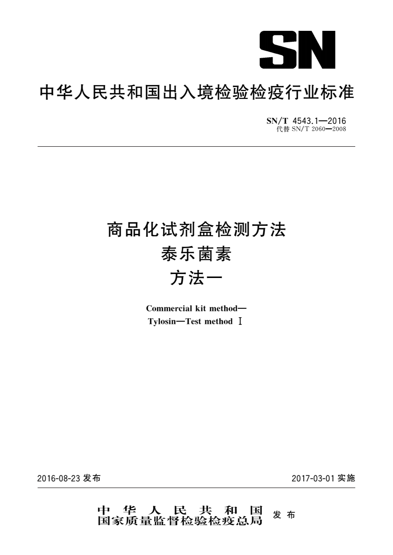 SN/T 4543.1-2016 商品化试剂盒检测方法泰乐菌素方法一