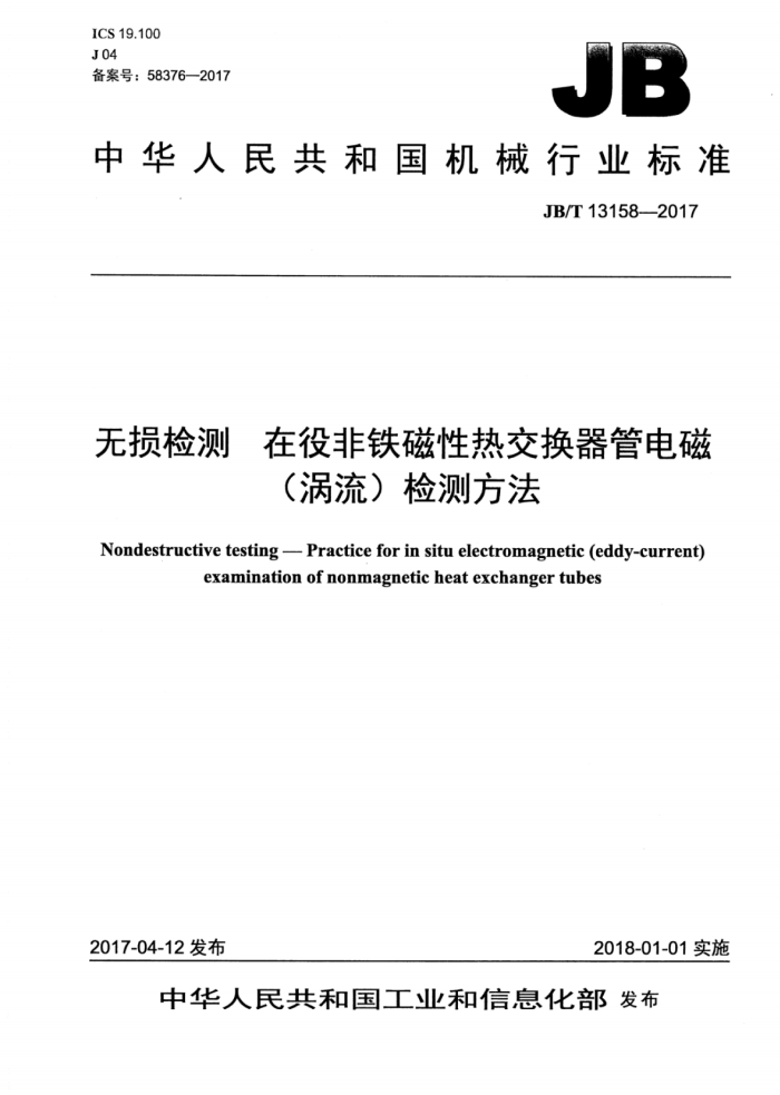 JB/T 13158-2017 无损检测 在役非铁磁性热交换器管电磁(涡流)检测方法